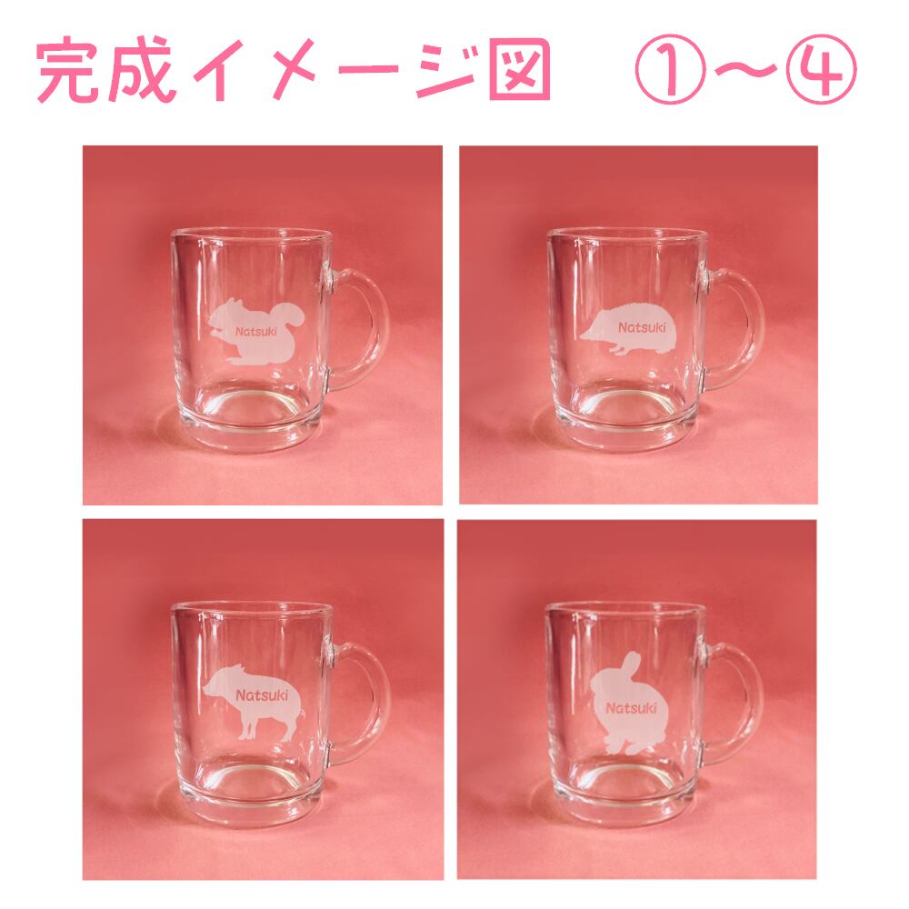 クリアなガラス製のマグカップに、お好きな動物とお名前を彫刻致します。